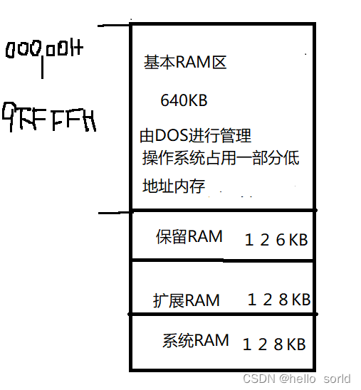 基本RAM区:(00000H-9FFFFH)由DOS进行管理。在这个区域中操作系统要占用掉一部分低地址空间,其他则向用户程序开放。