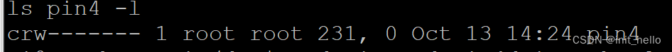 使用命令 ls pin4 -l可以查看文件的详细信息,231为主设备号,0为从设备号。生成的主次设备号由在驱动代码的变量major minor决定的。