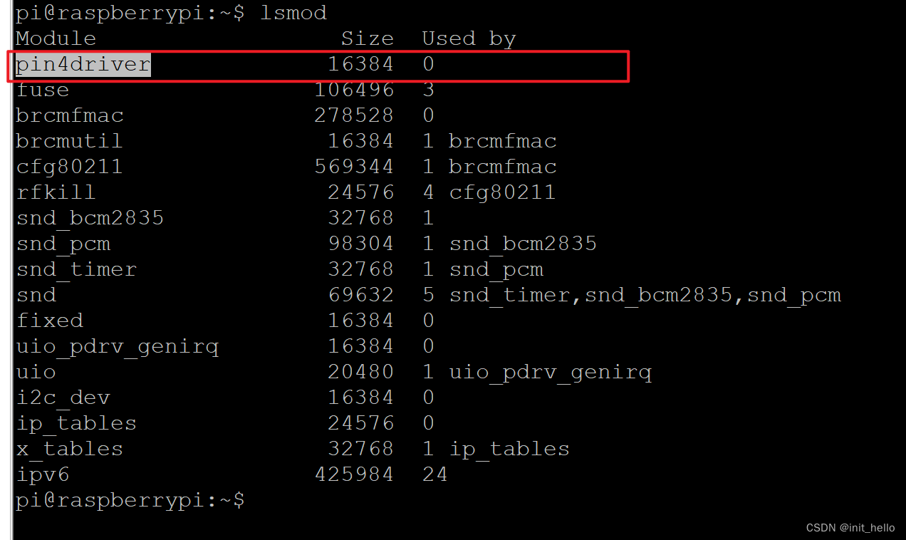 命令执行完成后可以执行lsmod命令,它用于列出已加载的内核模块 这里可以看到pin4driver已经被加载进去了。