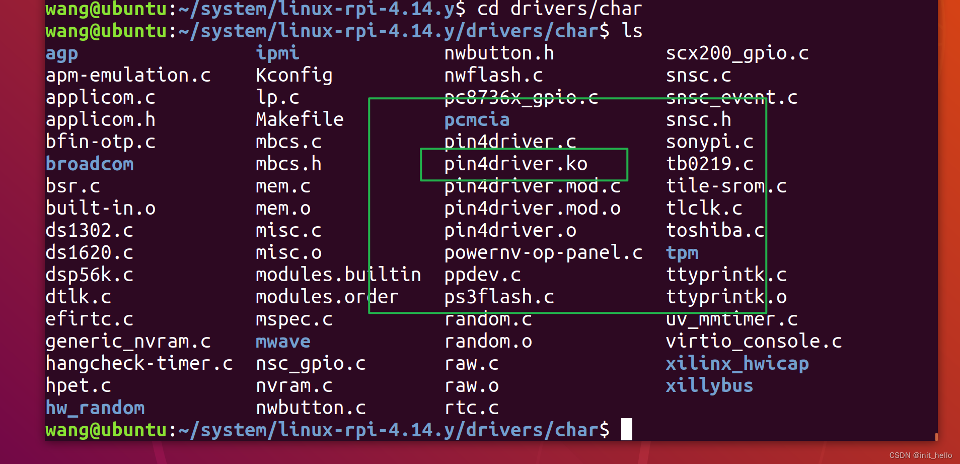 编译通过以后会在linux-rpi-4.14.y/drivers/char路径下生成pin4driver.ko文件。