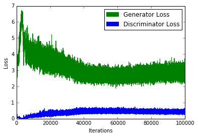 GAN 训练中一个常见的问题是 “我们应该在什么时候停止训练?”。由于鉴别器损失降低时,生成器损失增加 (反之亦然),我们不能根据损失函数的值来判断收敛性。如下图所示: