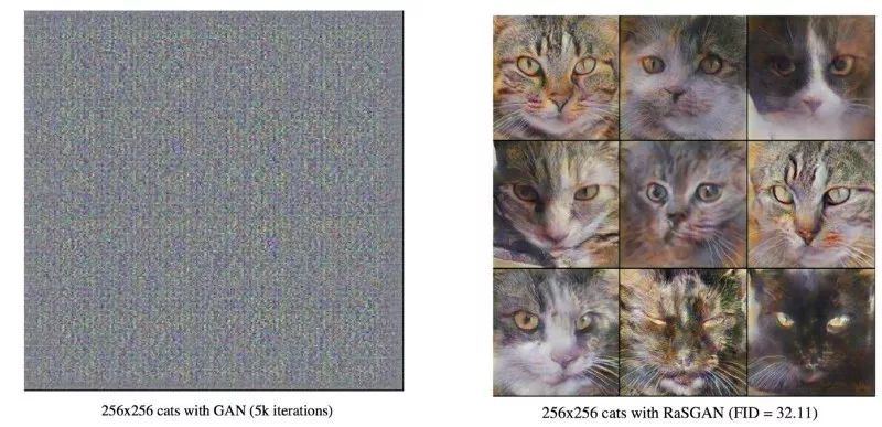 经过 5000 次迭代后,标准 GAN(左) 和 relativistic GAN(右) 的输出