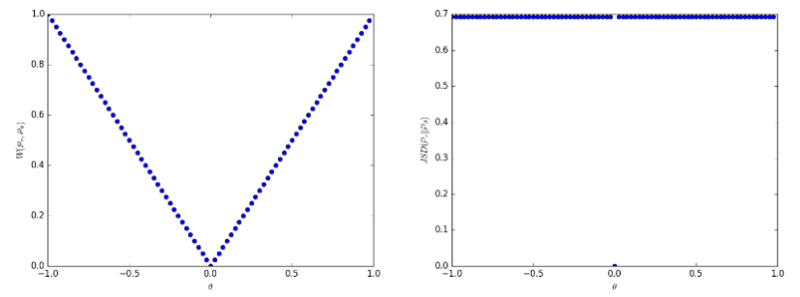 即使分布不连续,earth mover distance(左)也是连续的,与 JS 散度 (右) 不同