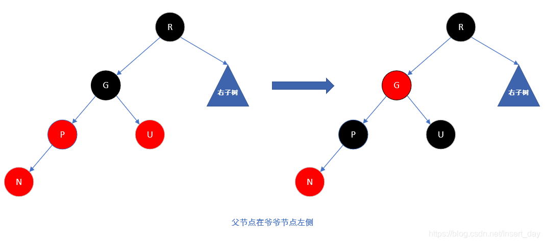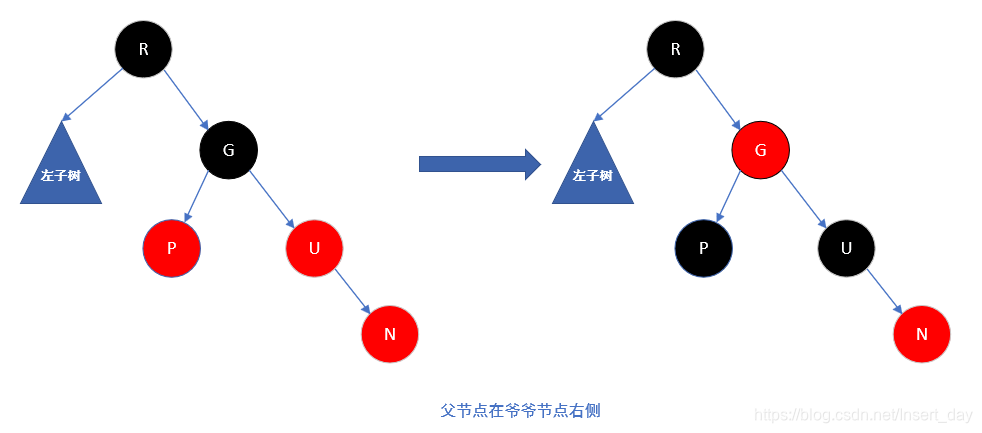 每一种情况根据新节点的父节点是爷爷节点的左侧还是右侧可以分为两种情况,所以可以细分为6种情况。