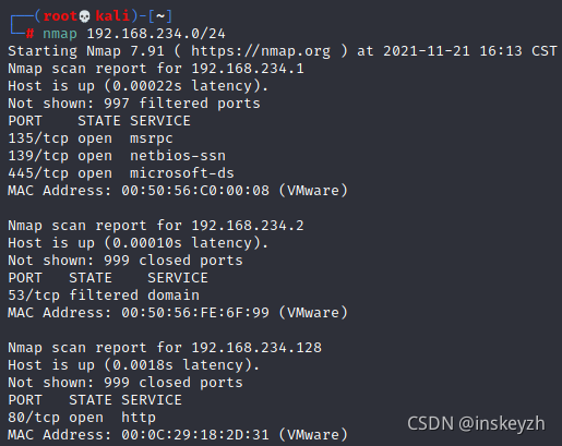 以此扫描该网段下所有主机,发现靶机ip地址:192.168.234.128