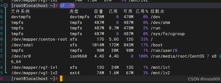 1.首先使用 df -Th 命令查看/目录的使用情况及挂载点。