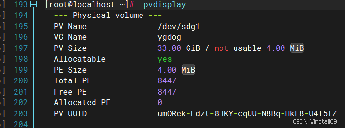 这里创建完可以使用 pvdisplay 命令来查看一下物理卷和卷组的情况: