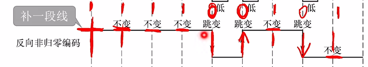 反向非归零编码(NRZI):看信号周期起点,跳 0 ,不跳 1,中不变