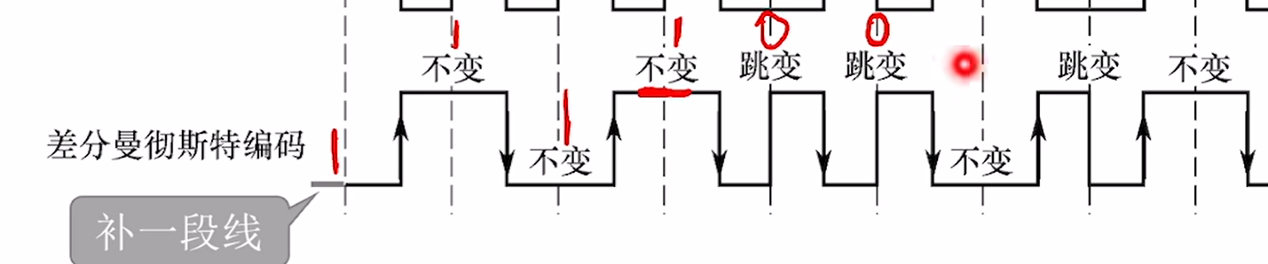 差分曼彻斯特编码:看信号周期起点,跳 0,不跳 1,中必变