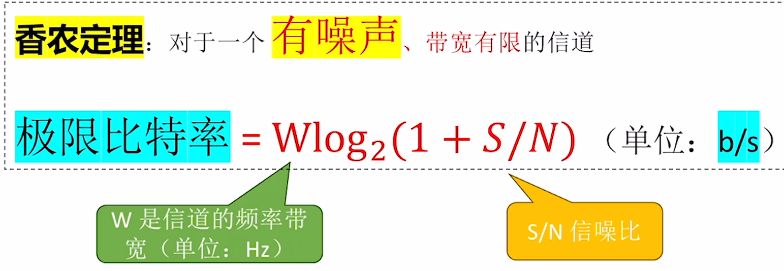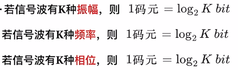 Ex:如果一个信号周期内可能出现8种信号,那么 1码元 携带 3bit数据,极限比特率 = 2W * 3 = 6W b/s
