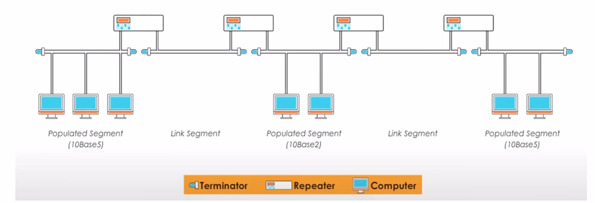 5-4-3 原则:使用 集线器(或 中继器)连接 10Base5网段时,最多只能串联 5 个网段,