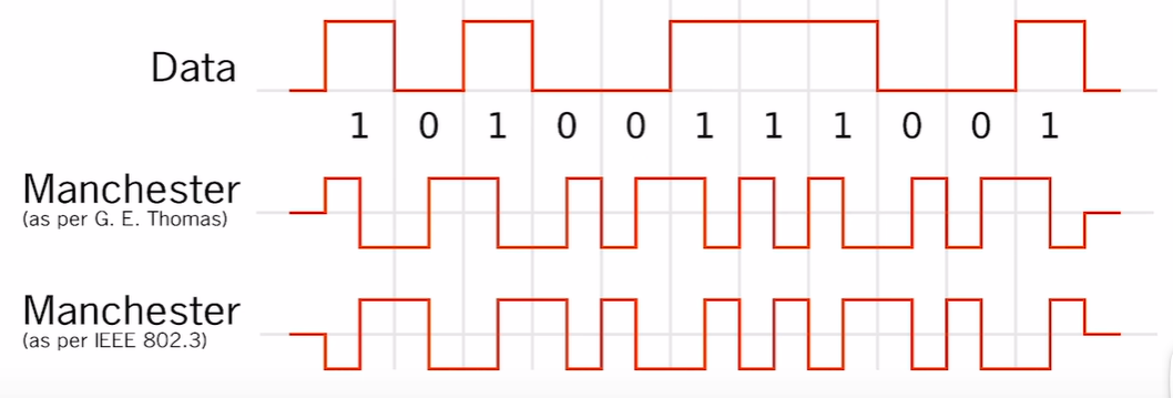 G.E. Thmos 发明了曼彻斯特编码,下跳 0,上跳 1;后来,IEEE组织,规定,上跳 0,下跳 1