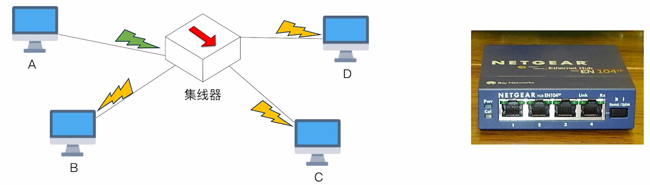 当用一个集线器连接多个节点后,所有结点会处于同一个冲突域