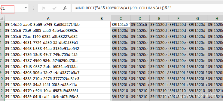 =INDIRECT("A"&100*ROW(A1)-99+COLUMN(A1))&""