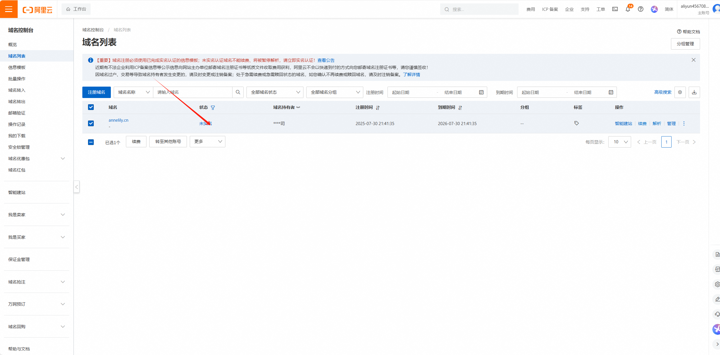 在域名列表中,找到需要进行实名认证的域名,点击右侧的“管理”或“实名认证”按钮。