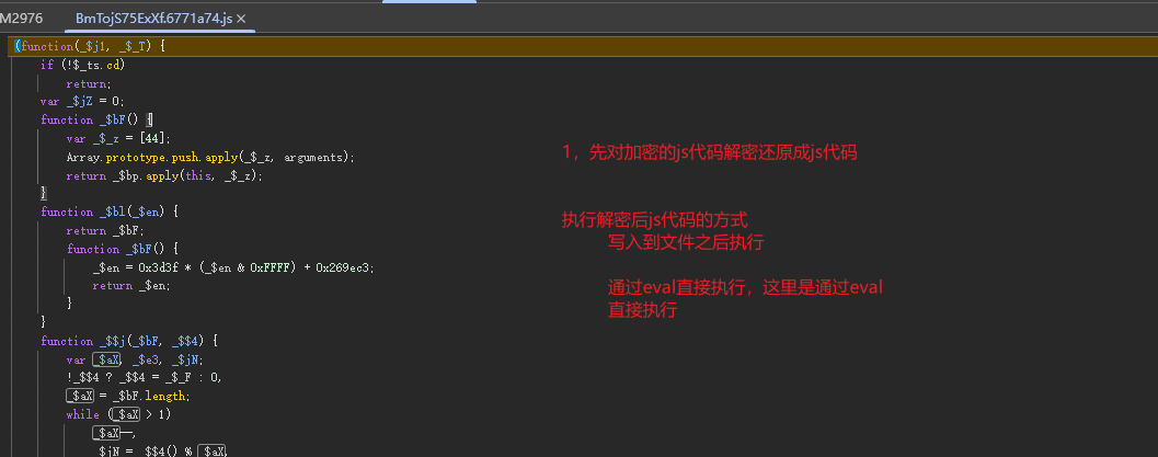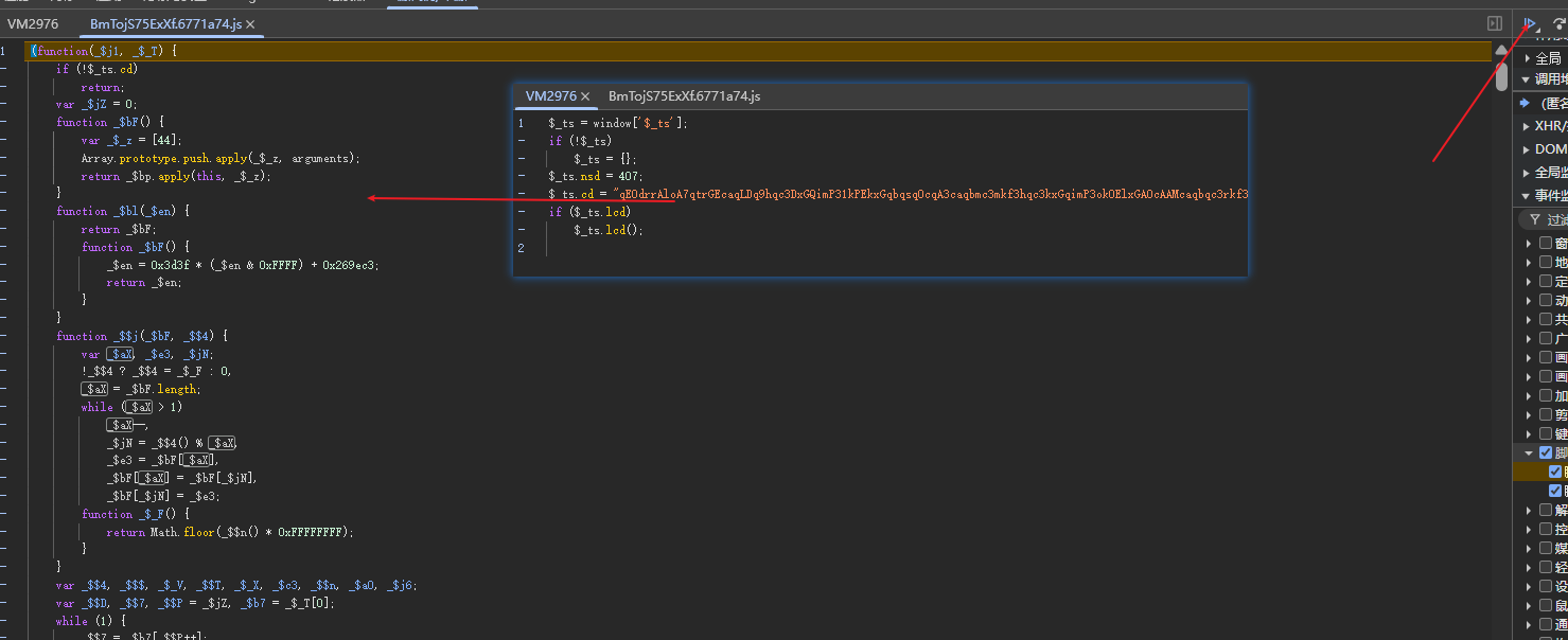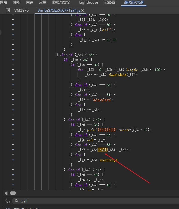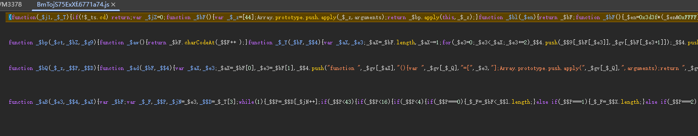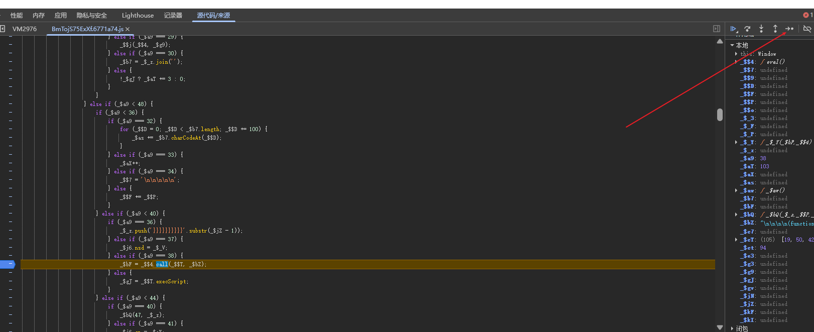 8,继续往后走又会走到这里来,执行这里的文件代码,第一次虚拟机的代码也就是cd后面的值其实是jsvmp位移混淆的,现在这个代码会将这个jsvmp位移混淆的代码变成可以执行的js文件也就是这个BmTo这个文件的eval去执行