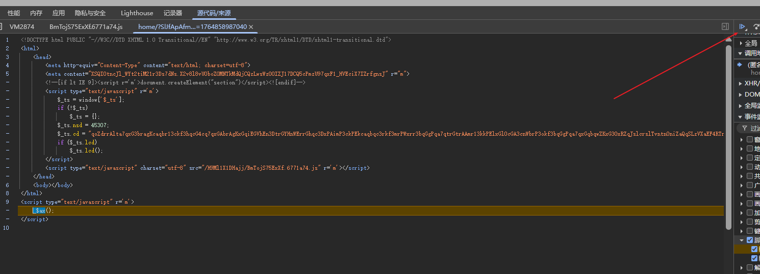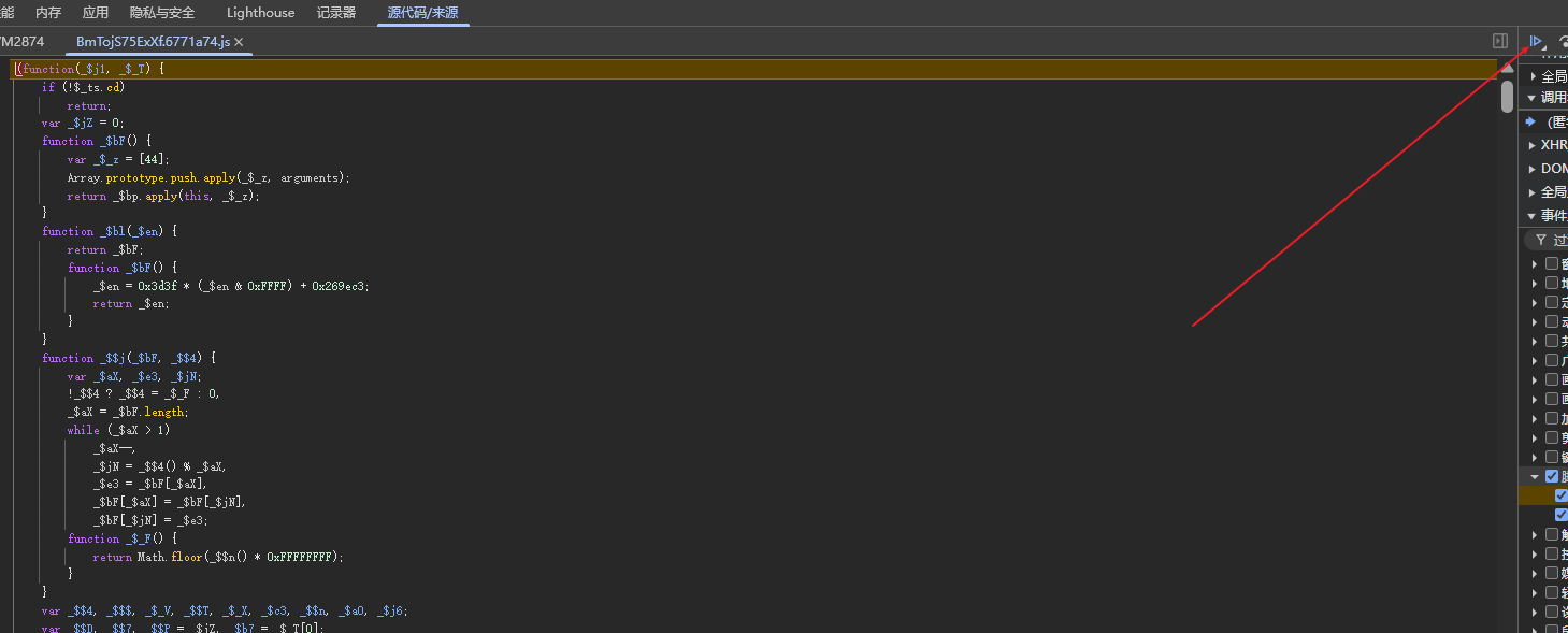 12,点击右侧的单步执行就可以跳到里面去,就可以看到解密之后的js文件
