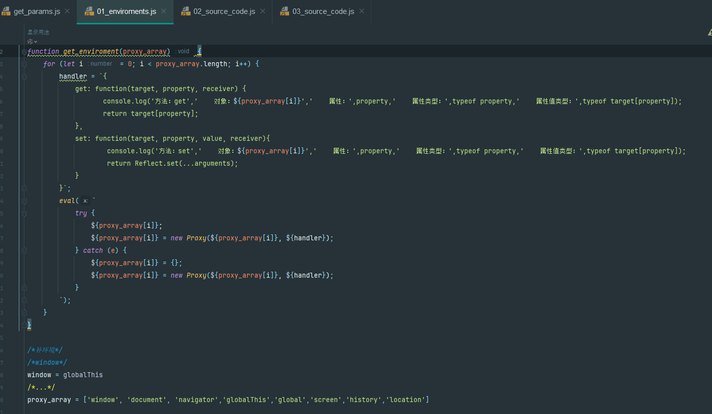 20,创建一个补环境的js文件,插入补环境的脚本,有一个细节就是我们要监控globalThis,因为在第二个混淆代码里面有globalThis检测的代码