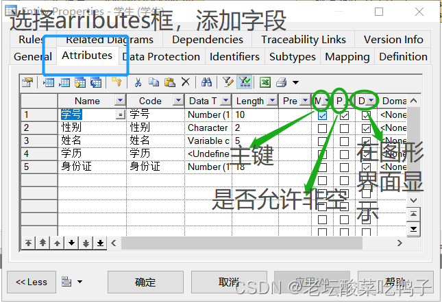 1. 在“学生选课数据库”概念模型中,建立一个“学生”实体,“学生”实体属性有:学号,性别,姓名,学历,身份证。主码:学号。