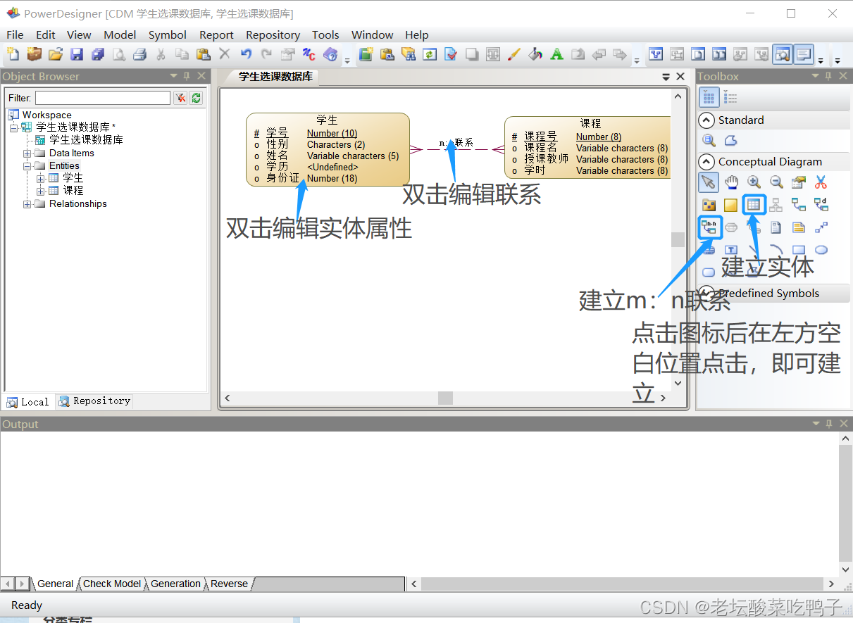 2. 在“学生选课数据库”概念模型中,建立另一个实体“课程”,“课程”实体的属性有:课程号,课程名,授课教师,学时。主码:课程号。“学生”实体与“课程”实体存在m:n联系。
