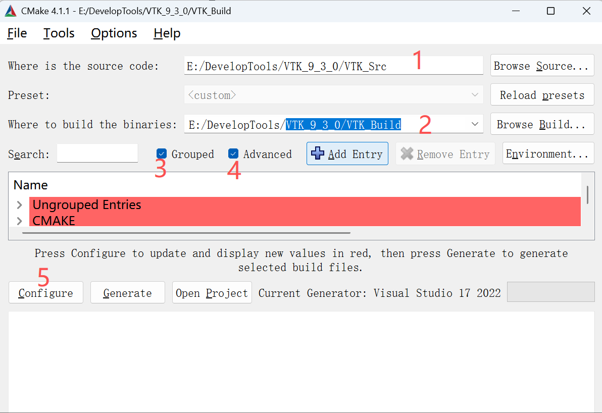 | CMAKE_INSTALL_PREFIX | ../VTK_9_3_0/VTK_Install | 前面让新建的文件夹,放最终库安装目录 |