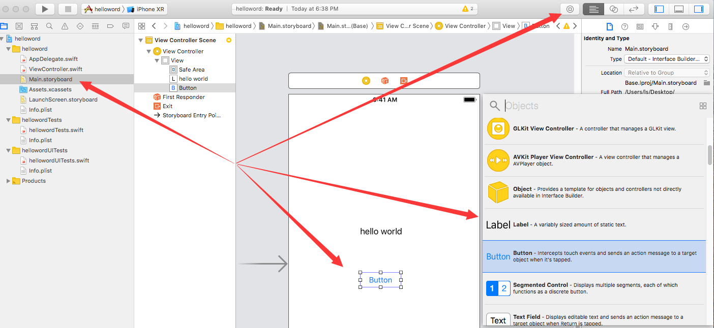 首先把两个控件放上去。双击“Main.storyboard”,点击右上角的控件按钮弹出控件窗口,然后在控件窗口上找到label和button,拖动到设计面版上。如下图所示