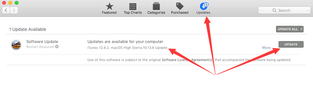 打开app store切换到“Updates”选项卡,看到可更新系统,点击其后的“UPDATE”即可。