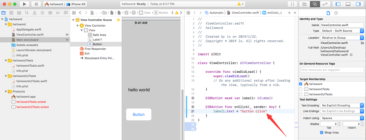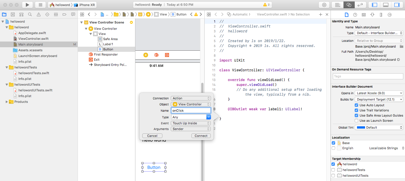 对button进行类似操作,设置好函数名。(可通过修改Event值处理不同的事件,默认“Touch Up Inside”表示单击事件)