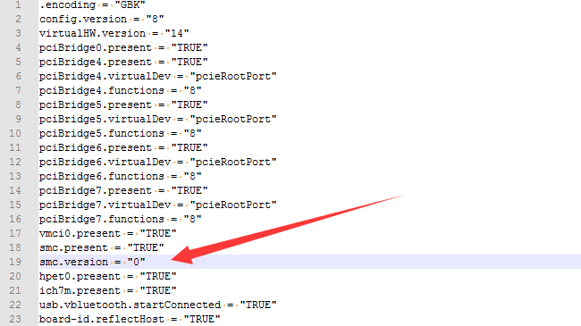 此时要到虚拟机存放目录下,使用notepad等打开.vmx在smc.present = "TRUE"后插入一行smc.version = 0(smc.version = "0"也没问题),再确定关闭虚拟机再启动即可。