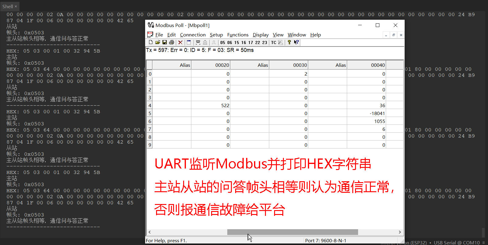 UART监听Modbus并打印HEX字符串,主站从站的问答帧头相等则认为通信正常,否则报通信故障给平台;后继还想:如果总线寂静1秒钟,判断总线故障了,接替PLC做主站轮询从站们。