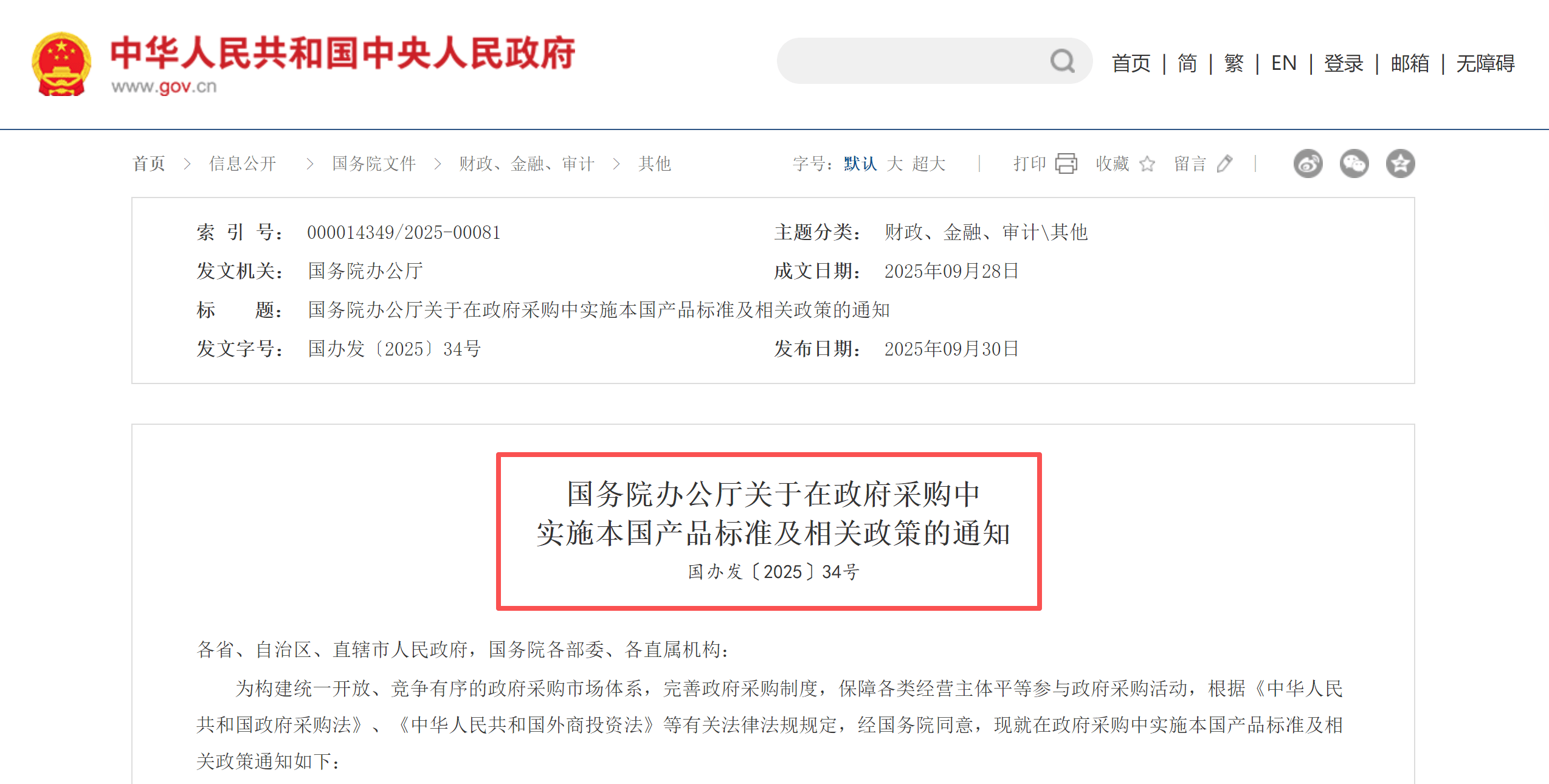 近日,国务院办公厅正式印发《关于在政府采购中实施本国产品标准及相关政策的通知》(国办发〔2025〕34号),明确了在政府采购中“本国产品”的界定标准及配套支持政策。