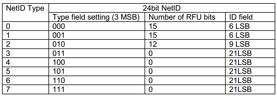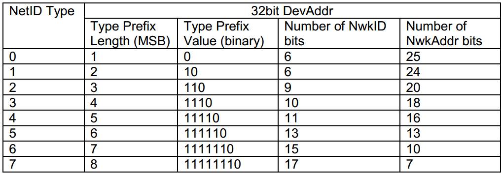 但从 v1.1.0 的核心规范开始注意网络漫游,将 DevAddr 管控起来,前缀不再使用高7bit,变得更加灵活,高级别成员才能享受到较多的设备地址数量。