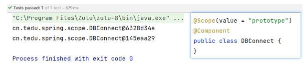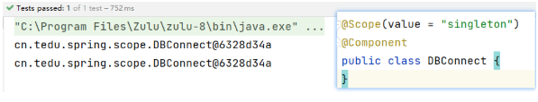 public class TestDBConnect { @Test public void testScope(){ ApplicationContext context = new AnnotationConfigApplicationContext("cn.tedu.spring.scope"); // 第一次获取 DBConnect dbConnect1 = context.getBean(DBConnect.class); System.out.println(dbConnect1); // 第二次获取 DBConnect dbConnect2 = context.getBean(DBConnect.class); System.out.println(dbConnect2); } } -