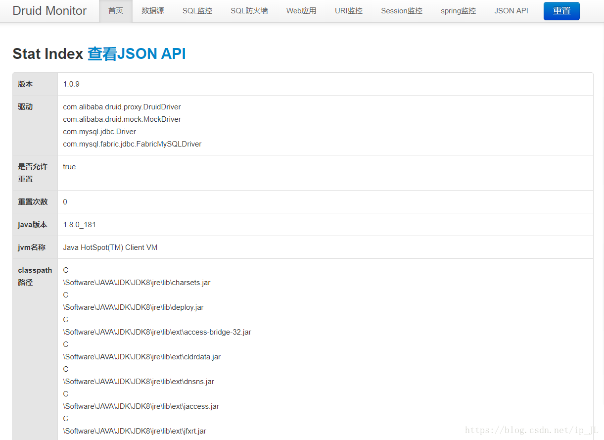 启动Springboot后打开网页"http://localhost:8080/druid", 账号密码都是root