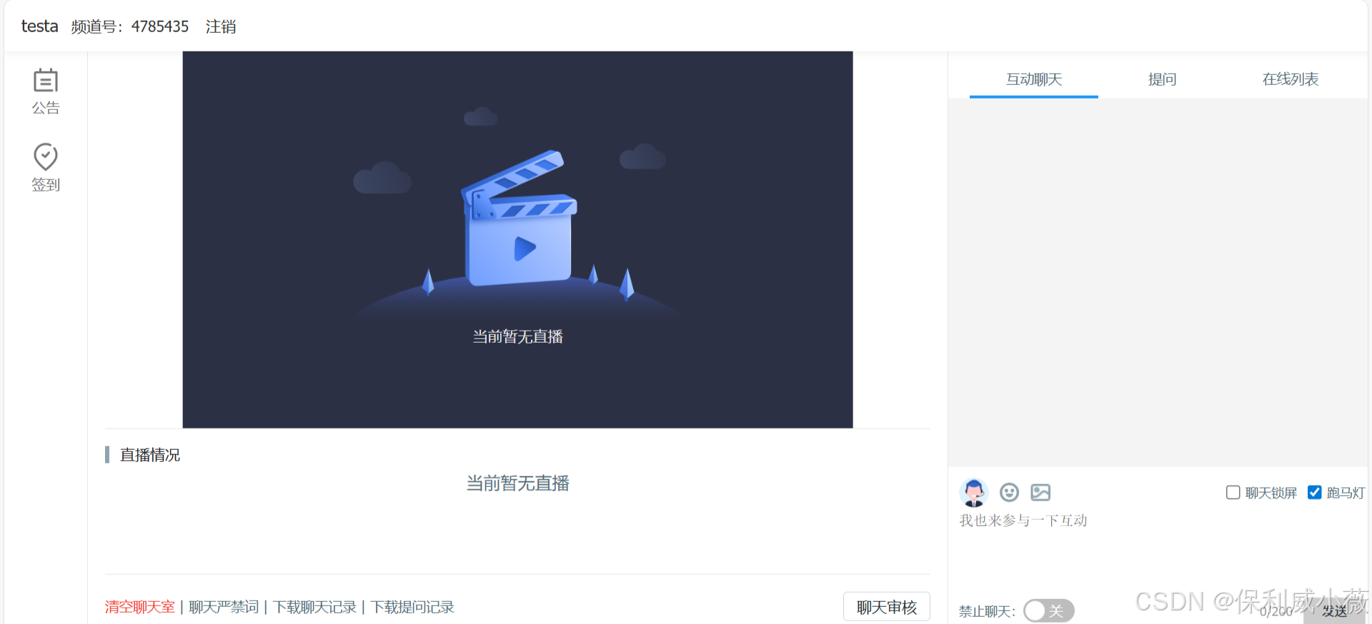 (2)测试模式开启后,只有助教以及管理员才能看到直播,其他人看不到。测试模式可以提前让直播管理人员了解直播界面、确认直播流程、确定直播内容准确无误。正式开启直播需要关闭测试模式。
