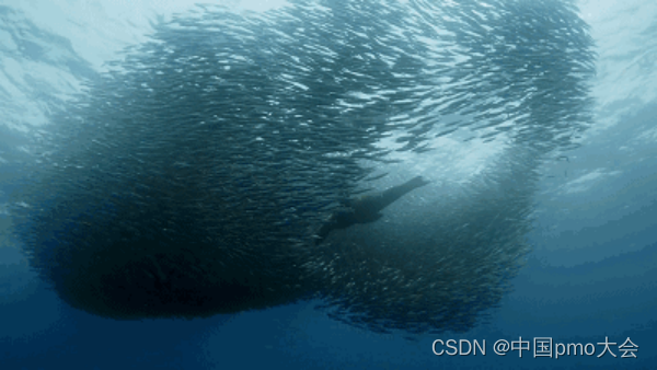 数字纪元的沟通协作模式像是这张图中鱼群的合作模式。鱼群没有领头鱼,信息传递去中心化,不是从上到下的传递,而是横向广泛存在的。关键是,去中心化的鱼群整体队形不断变化,无数小鱼同时向同一个方向游、同时转向。这种自然现象,称为“自组织”。