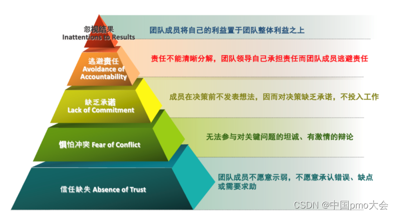 团队效能方面的模型,比较广为使用的是Patrick Lencioni的Five Dysfunctions of a Team 模型。这个模型从下到上分析了团队失效的五大原因:由于团队成员之间缺乏信任,因此大家不敢直面冲突,有话都唱着掖着,以至于对共同的工作没有承诺,不担责,最终自然忽视了团队的整体结果。
