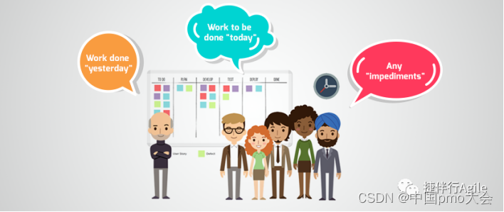 团队成员说明自上次站会以来的完成了什么、下一次站会将会完成什么工作、以及是否存在会阻碍他们工作进展的问题。