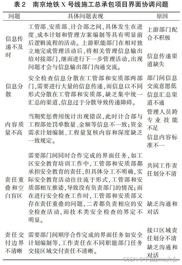 本文通过对南京地铁X号线大标段施工总承包管理部上述八种组织界面进行问题识别,得出具体问题,并以问题为导向确定组织目标。问题识别的方法为通过对总包部职能进行WBS-OBS矩阵分解,得出不同职能部门在不同管理活动中担任的工作任务角色。WBS分解将管理职能工作分为三级,第一级为合同管理、质量管理、安全管理、进度管理、成本管理、前期管理、采购管理,第二级为各管理职能的计划、执行、检查和处理四个阶段。OBS则分解到职能部门层面。一般工作任务角色则分为计划、决策、执行、检查、提供信息、获取信息。从这三个维度进行驻点调研,对职能部门工作人员进行三次访谈,得出X号线总承包项目管理部组织界面问题,如表2所示。