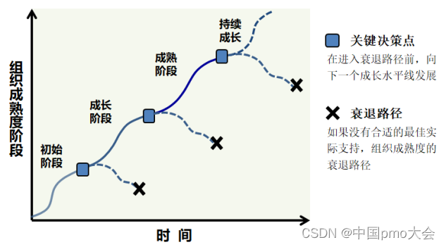 PMO组织的成长是阶梯式的,不是线性连续的,它不会随着时间的发展自然的从一种形态进阶到另一种形态,如果没有抓住契机,推动其向下一个阶梯跃进,则很有可能经过一段时间后走向衰退。正如企业的组织成熟度,随着时间的推移,在进入衰退路径前的关键决策点,必须有合适的最佳实践支持组织变革,从而向下一个阶段发展,否则,组织很可能会走向没落。组织变革的关键决策点,正是PMO进阶的契机,PMO在推动或协助组织变革时,也要抓住契机,与组织一同完成自身的变革,这样才能更好的服务于组织的发展,同时完成自身的进阶。