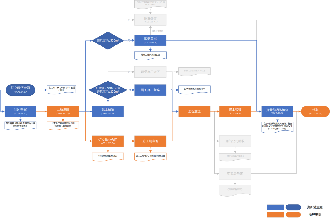 通过流程图,可以看出场地备案、图纸审查、施工备案和消防检查是一个不断取得外部授权的过程,合规性贯穿始终。通过前期人员的努力,取得各条线办理路径,厘清流程间逻辑关系。