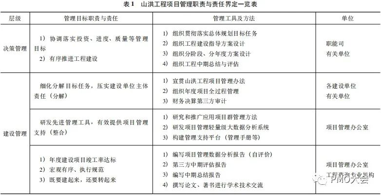 实践表明,作为临时性项目管理过程中对职能管理的补充,山洪工程项目群管理模式中第一个重要环节是给出建管职责与责任界定。即在山洪工程项目群管理模式下,理顺管理部门与建设单位以及建设单位间的项目管理边界,使建管职责界面比较清晰,详见表 1。总体来看,山洪工程项目管理组织结构基本属于弱矩阵 ( Weak Matrix Organization) 形式,即职能分工与临时项目管理组织结合,临时性的项目管理办公室只有少数全职人员,大部分管理工作还是靠职能部门完成,相关单位各司其职[2,9]。