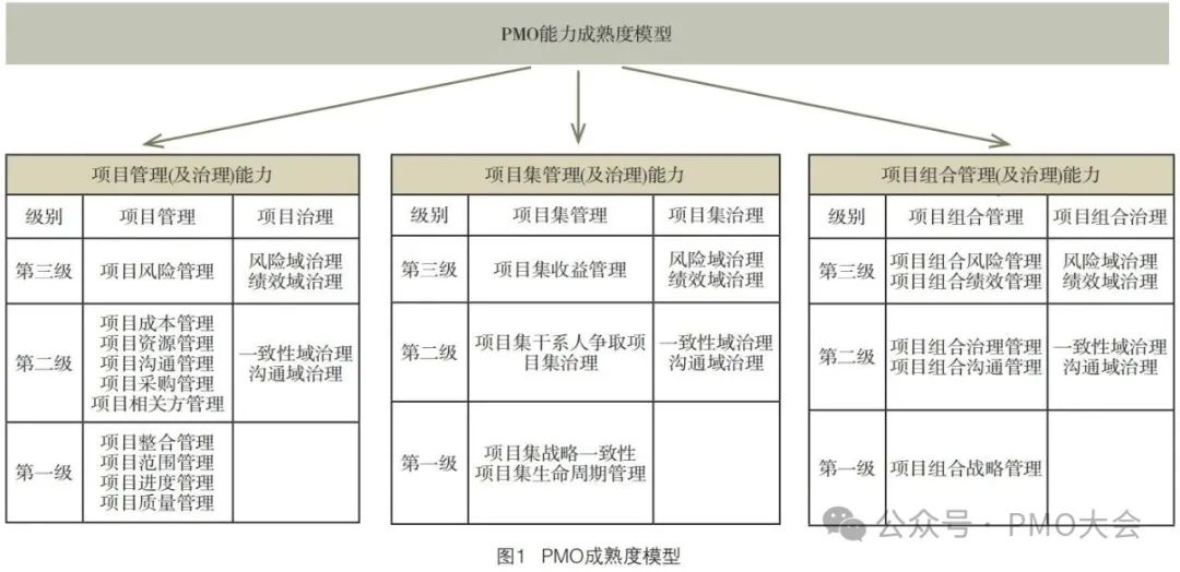 PMO能力成熟度模型将PMO的能力划分为项目管理(及治理)能力、项目集管理(及治理)能力以及项目组合管理(及治理)能力。其中每种能力都包含“管理”和“治理”两个方面。PMO既是对项目、项目集和项目组合进行管理的机构,同时也肩负着项目、项目集和项目组合治理的艰巨任务,如图1所示。