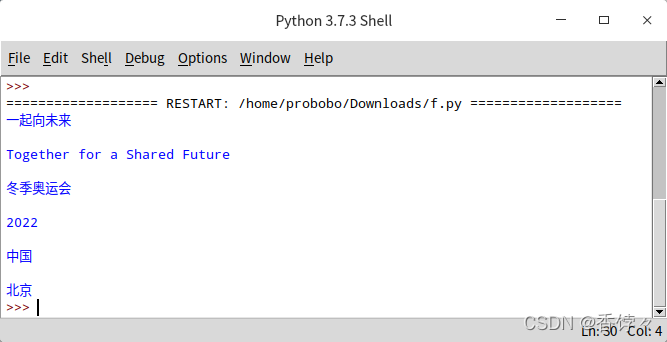 | <f>.writelines(lines) | 将一个元素全为字符串的列表行写入文件,当前行自行首起覆盖相应字符。 >>> open('f.txt','a').writelines(['2022\n','中国\n','北京']) >>> open('f.txt').readlines() ['一起向未来\n', 'Together for a Shared Future\n', '冬季奥运会\n', '2022\n', '中国\n', '北京'] | |