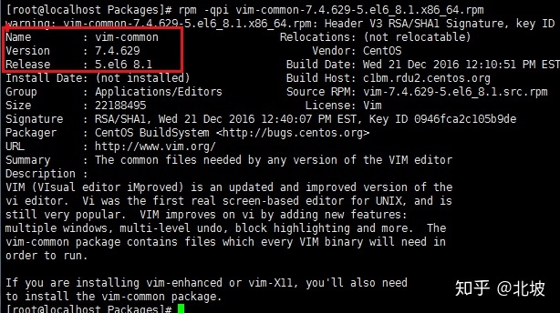 rpm -qpi vim-common-7.4.629-5.el6_8.1.x86_64.rpm,框框部分,就是rpm命名规则的部分内容