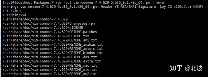 如果要查询这个软件包,会被安装到哪个位置,可以用:rpm -qpl 未安装的软件包,比如:rpm -qpl vim-common-7.4.629-5.el6_8.1.x86_64.rpm | more, 这里的"| more"使用来分页显示。