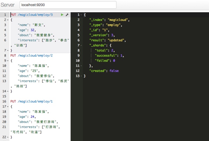 在magicloud这个公司,总共有三个员工。其名字分别为:陈发强,陈真强,斯文。在员工信息统计中我们需要将此三人的以下几个信息记录在员工信息库里面。分别为: 姓名(name), 年龄(age), 自我介绍(about), 兴趣(insterests)所以我们需要一个叫magicloud的Index (库)employee的Type(表) document id为1 字段分别为name、age、about、interests。因此我们需要写入以下几行数据。