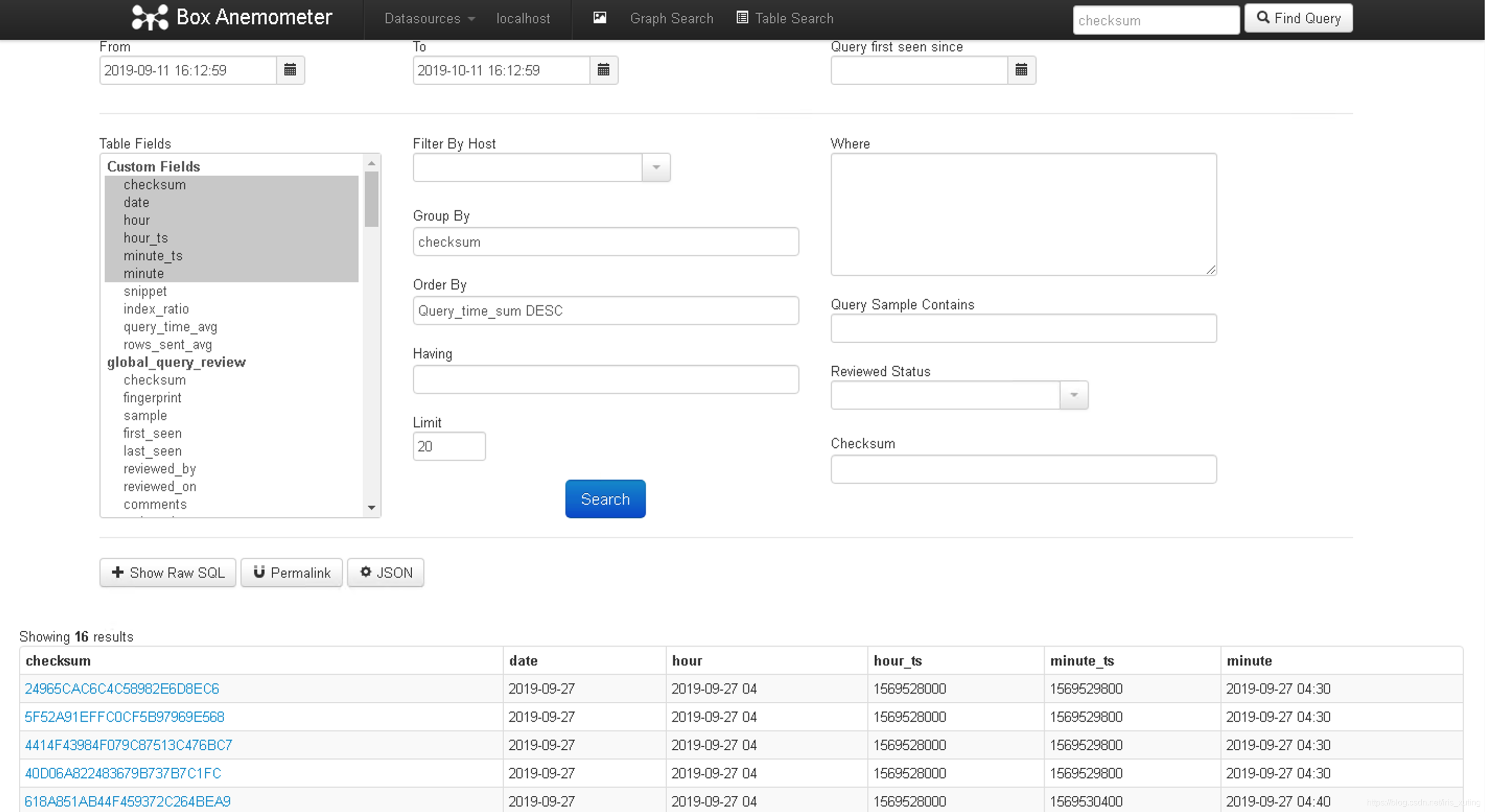 [root@localhost anemometer]# pt-query-digest --user=root --password=root --review h=localhost,P=3306,D=slow_query_log,t=global_query_review --history h=localhost,D=slow_query_log,t=global_query_review_history --no-report --limit=0% --filter=" \$event->{Bytes} = length(\$event->{arg}) and \$event->{hostname}=\"$HOSTNAME\"” /data/contract-trade_slowlog_20190927.log