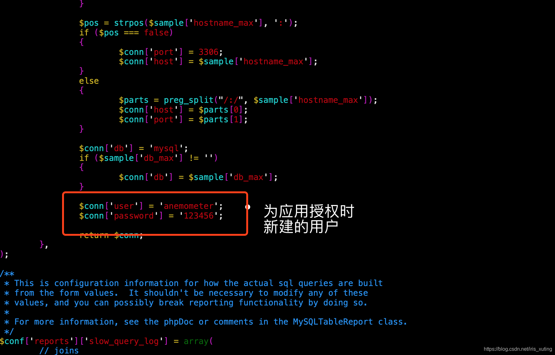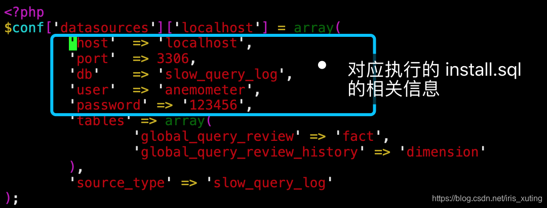 该配置文件指明,pt 分析后的慢日志信息存储的MySQL 实例和 user 相关信息