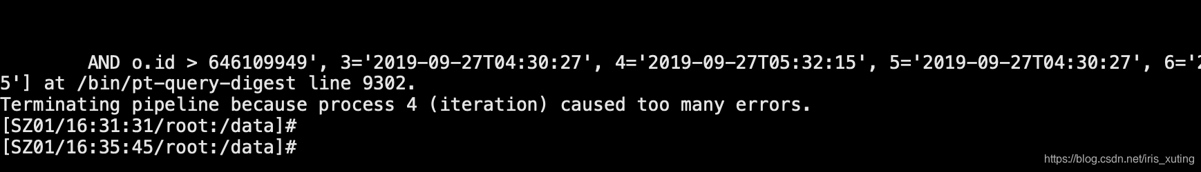 Pipeline process 5 (iteration) caused an error: Redundant argument in sprintf at /usr/bin/pt-query-digest line 2556. Will retry pipeline process 4 (iteration) 2 more times. Pipeline process 5 (iteration) caused an error: Redundant argument in sprintf at /usr/bin/pt-query-digest line 2556. Will retry pipeline process 4 (iteration) 2 more times. The pipeline caused an error: Pipeline process 5 (iteration) caused an error: Redundant argument in sprintf at /usr/bin/pt-query-digest line 2556. Terminating pipeline because process 4 (iteration) caused too many errors.